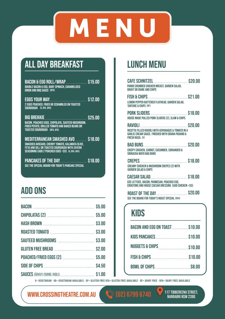 The Crossing Café is open Monday to Friday from 9:00am to 3:00pm serving brunch from 9:00am to 2:00pm